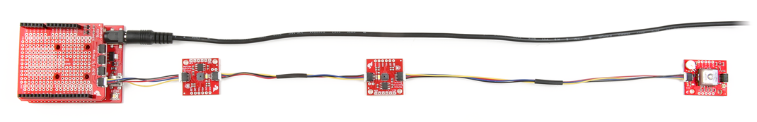 The cables can be easily plugged in between the boards, which makes quick work of setting up a new prototype easier. Sparkfun currently offer three different lengths of QWIIC cables as well as a breadboard-friendly cable. Initially, you may need to solder headers onto the shield to connect your platform to the QWIIC system, but once that's done, it's plug-and-go!