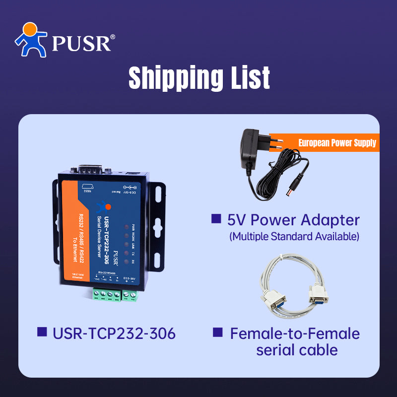 The USR-TCP232-306 is an industrial serial-to-Ethernet converter for data transmission between RS232 devices and TCP/IP networks. It supports multiple operating modes such as TCP Server/Client, UDP, and HTTPD, and provides a stable connection for industrial control and IoT applications. Its compact design, simple web configuration, and wide voltage range make it highly versatile.